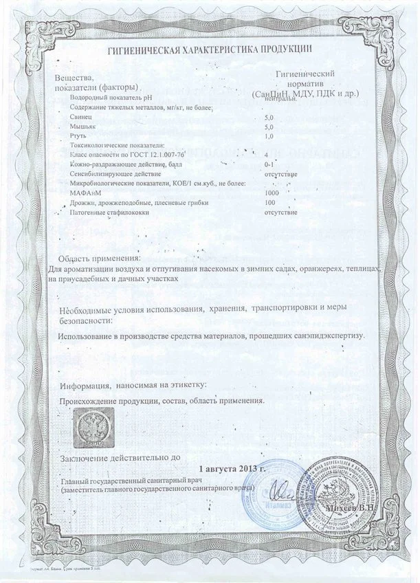 Для ароматизации зимних садов, оранжерей, теплиц и предохранения растений и рассады овощных и цветочных культур от тли различных видов, оранжерейной белокрылки, паутинных щитовок, ложнощитовок, червецов и других вредителей. Экологичен (уникальный комплекс натуральных компонентов), обладает длительным защитным действием, удобен в применении.